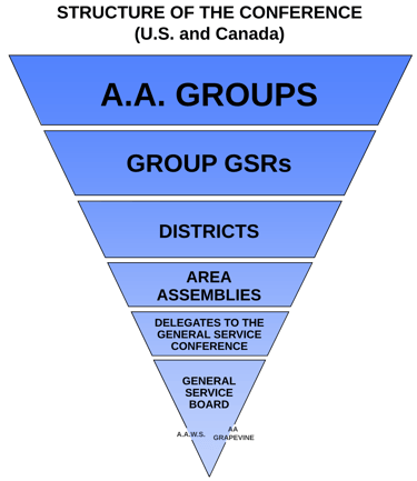 Individual groups elect general service representatives (G.S.R.s) who attend district meetings. This group elects the district committee member. The D.C.M. conveys the group conscience of their district’s A.A. members to the area committee.